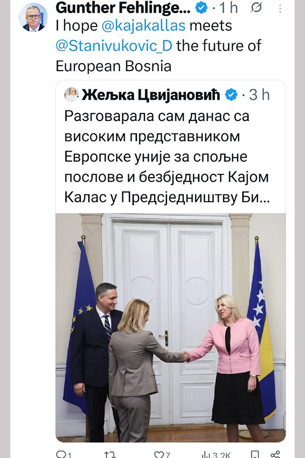 Željka Cvijanović, članica Predsjedništva BiH, oglasila se na društvenim mrežama, nakon sastanka sa šeficom europske diplomacije Kajom Kallas, a potom su uslijedile brojne reakcije.