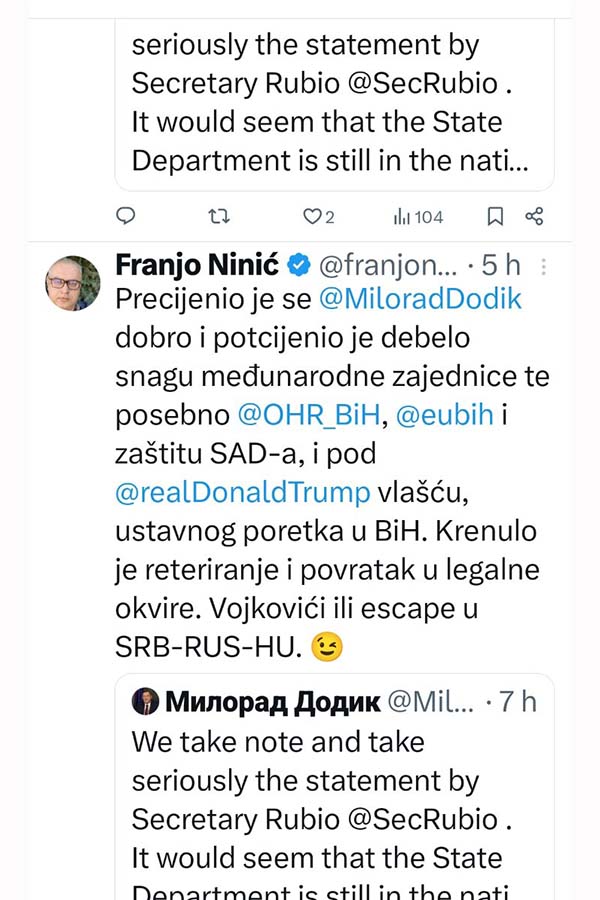 Nakon Dodikovog istupa na društvenim mrežama u kojem je pisao, pa brisao postove, te vrijeđao američkog državnog tajnika Marca Rubija, te poslije izbacio taj dio iz objave, uslijedile se brojne reakcije.